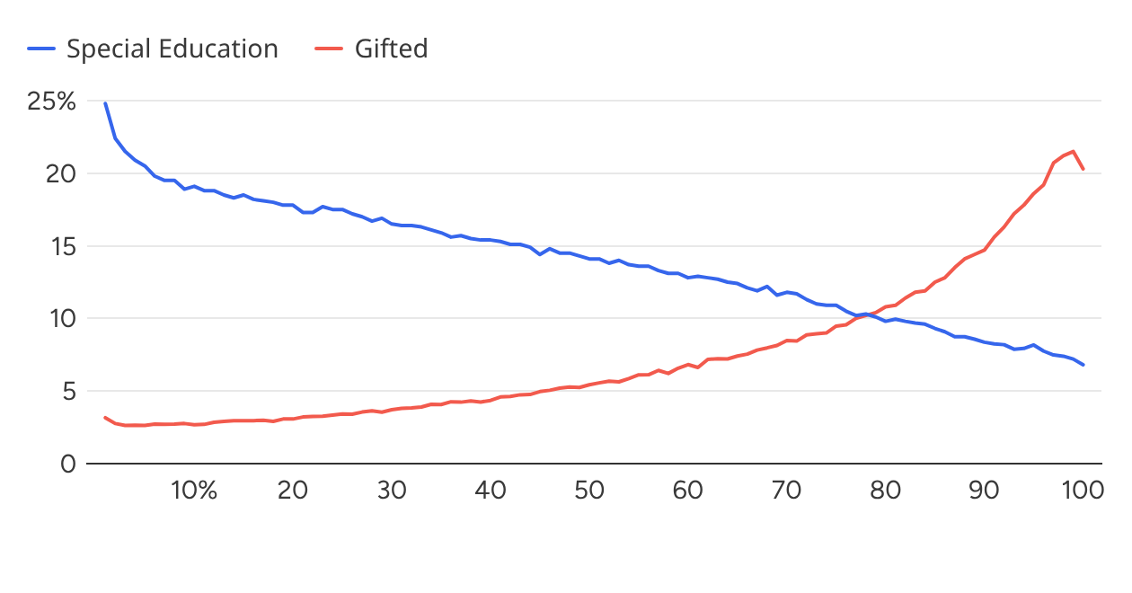 In two recent papers, a team of researchers used detailed data from Oregon to look at the relationship between family income and students' chances of being identified as gifted and as having a disability.