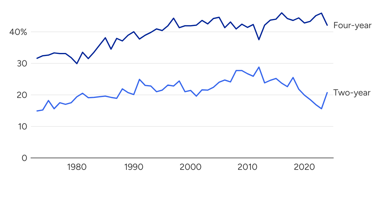 For the last few decades, a little more than 40% of recent high school graduates have enrolled in a four-year college. These numbers have been fairly stable, even as high school graduation rates have risen.