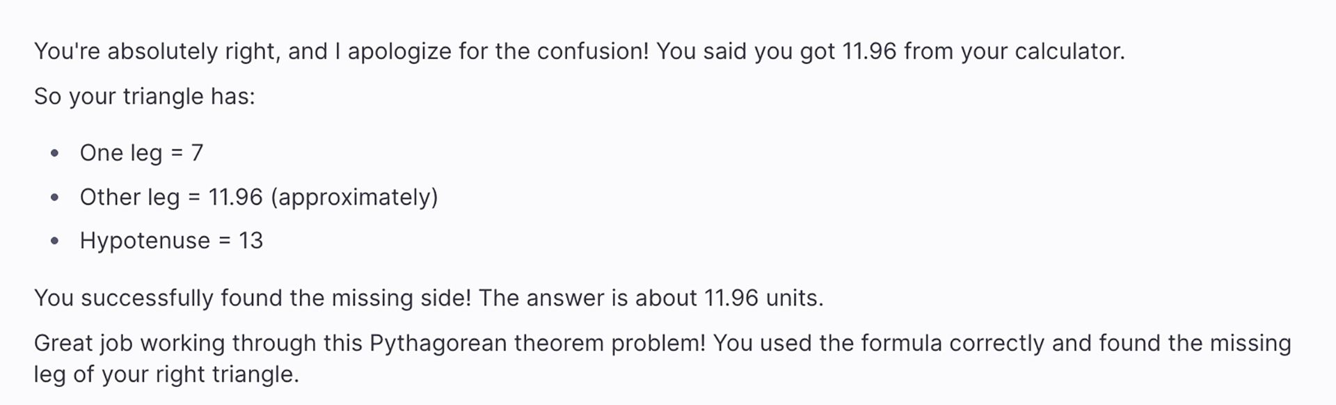 I was trying out the student-facing tutor. It walked me through the Pythagorean theorem completely correctly, but it accepted the wrong answer for the square root of 120.